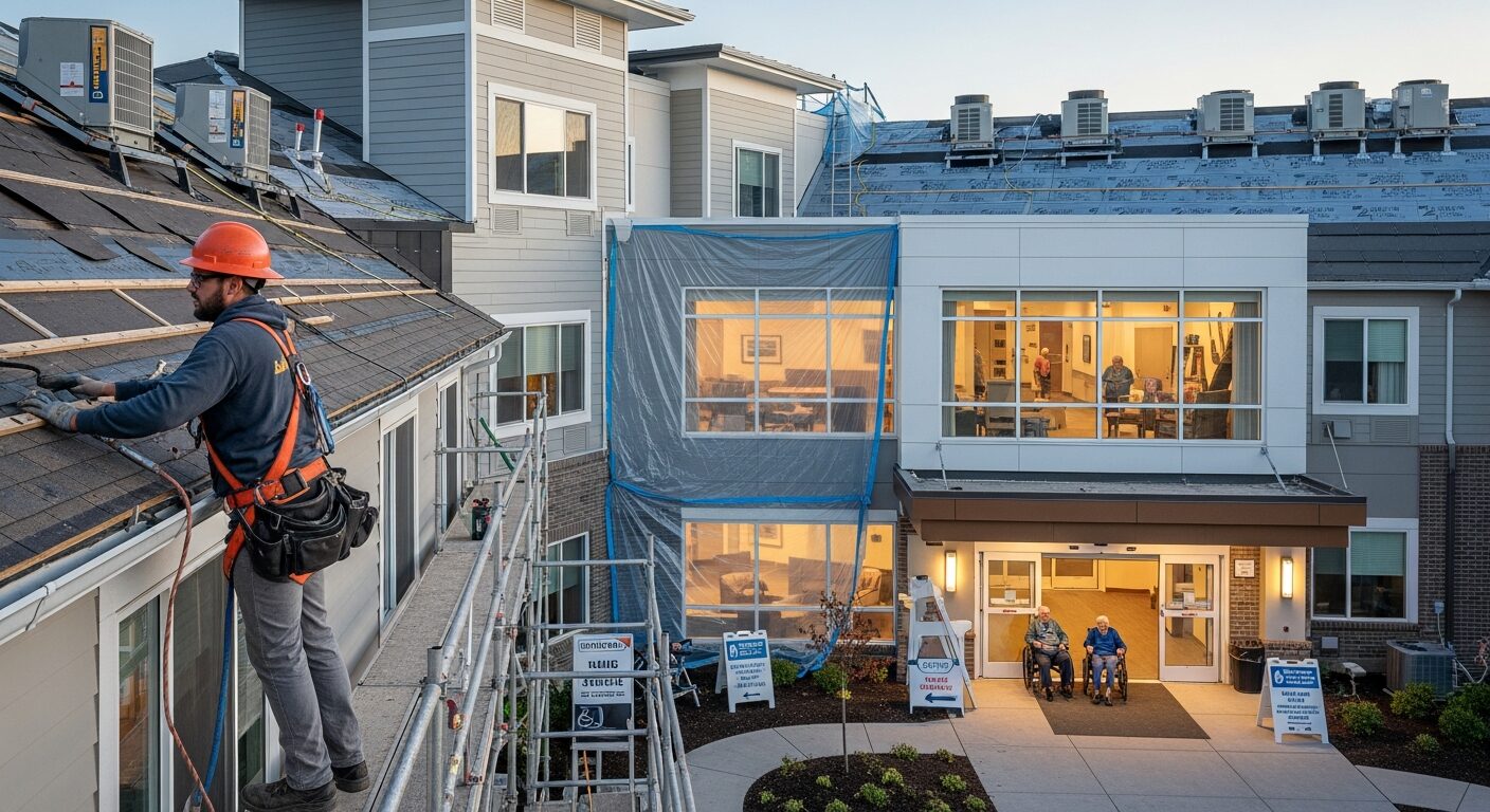 Roof failures, water intrusion, and exterior degradation accelerate aging in senior facilities. Energy-efficient roofing reduces utility costs while extending the building’s lifespan. A professional roof replacement typically takes 2–4 weeks and is best scheduled in spring or fall to minimize weather delays and temperature-sensitive resident comfort.
