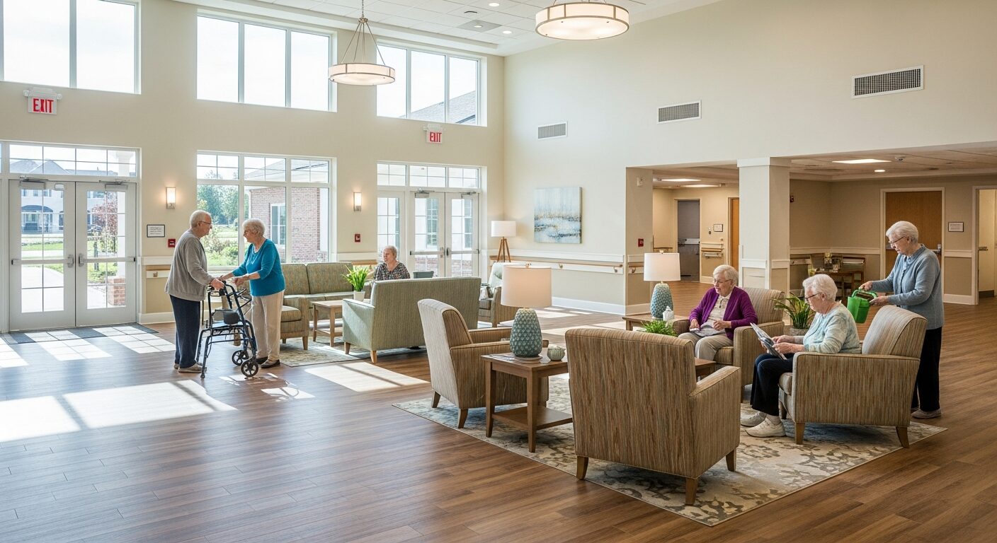 • Wayfinding and orientation: Clear, intuitive design reduces resident confusion and falls
